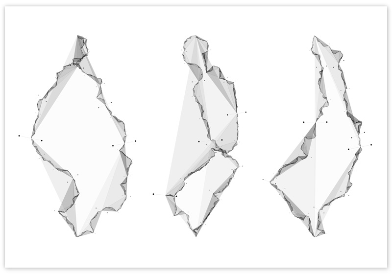 "Self-Dividing Line is a limited edition, gallery quality print of the source codeSelf-Dividing Line algorithm. In this work I have arranged only six lines, in pairs, spaced evenly across the page. The natural recursive process of self division quickly breaks the lines into classic coastline fractals you see."